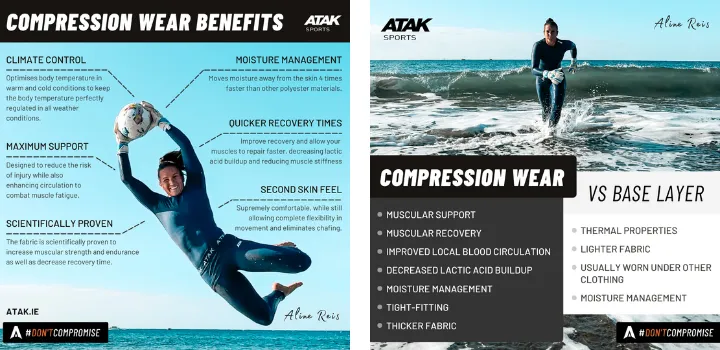 Injury prevention is paramount for athletes looking to sustain long-term performance gains and avoid setbacks. Compression Sportswear acts as a supportive exoskeleton, stabilizing joints and helping to reduce the risk of common sports-related injuries such as strains, sprains, and muscle tears. The compression technology provides an added layer of protection during high-impact activities, allowing athletes to push their limits with confidence and minimize the likelihood of injury occurrence. It is imperative that ATAK Sportswear be fitted correctly in order to avail of these benefits – ATAK Compression Wear should be tight fitted and feel compressive, almost to the point of discomfort – but should not be uncomfortable or reduce mobility. It can be strange wearing compressionwear for the first time: stick with it, the benefits are worth it.